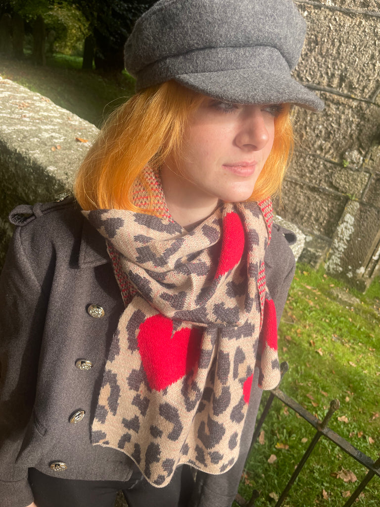 Fun and funky heart detailed knit scarf on leopard background. Reversible design with narrow stripe allows you to wear it both ways.