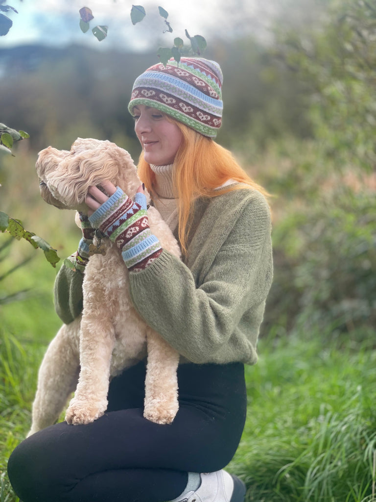 A soft knit Nordic design hat. Pull on with turn up. Multi coloured in green, browns and blues.