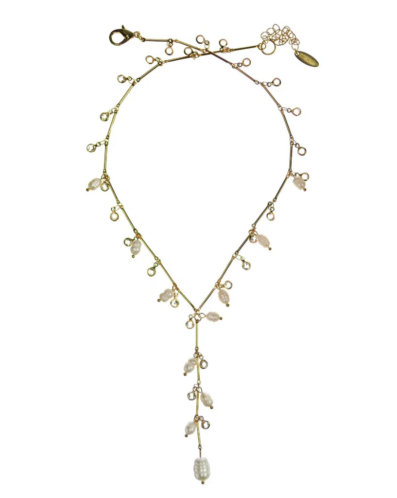Crystal and fresh water pearl droplets fall from a gold chain.