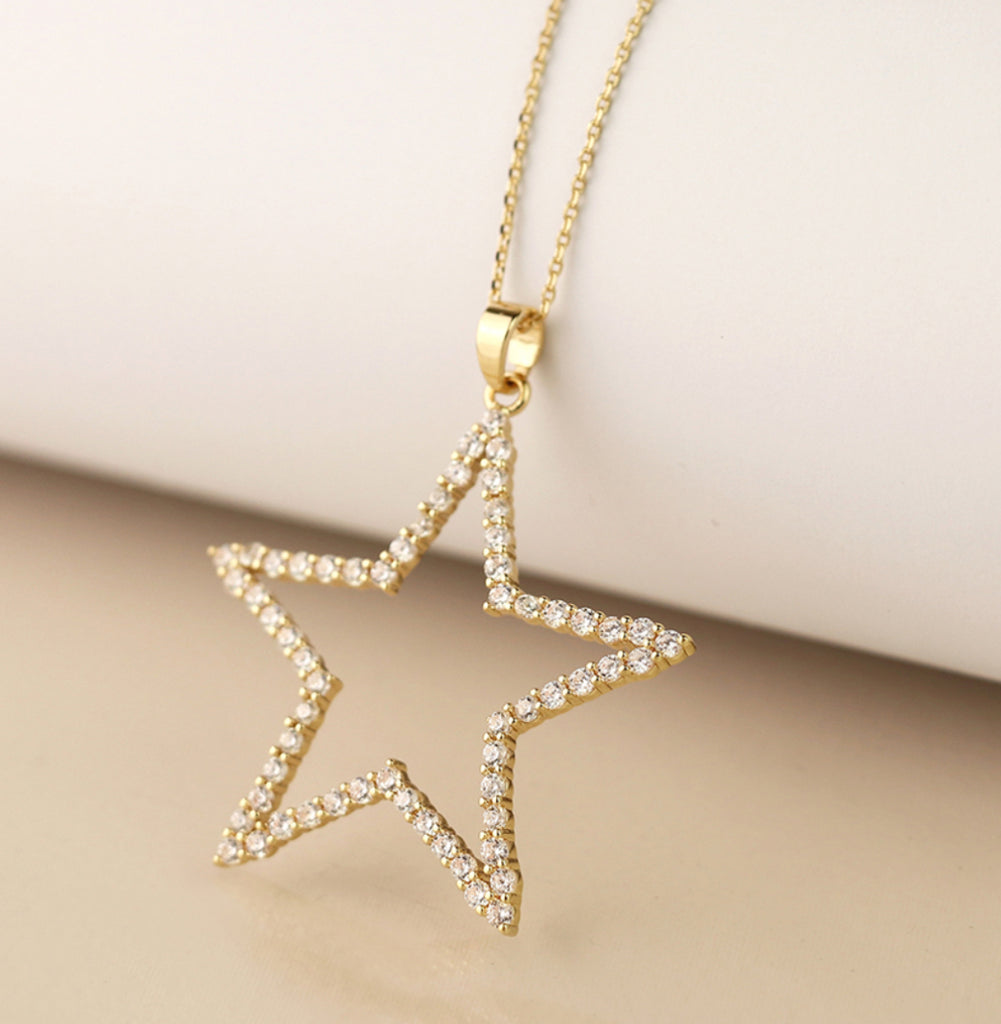 Gold pave star necklace, Clear crystal set in gold, on fine chain .