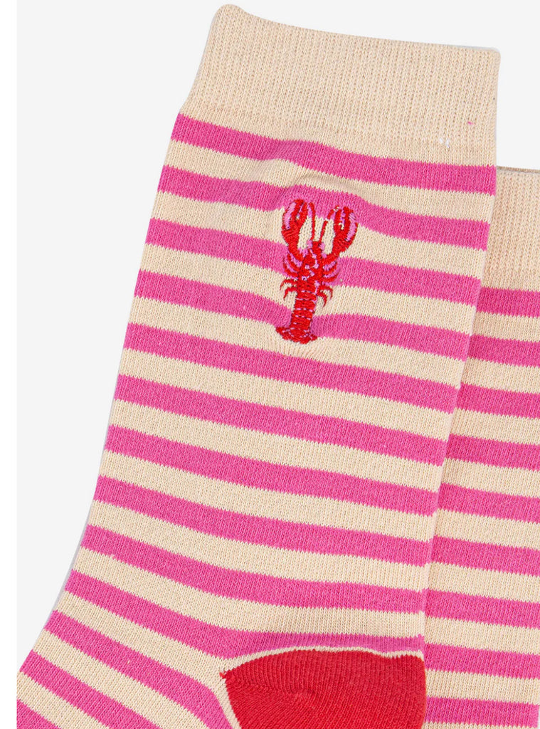 Super soft socks in cream pink and red stripes, with red embroidered lobster.